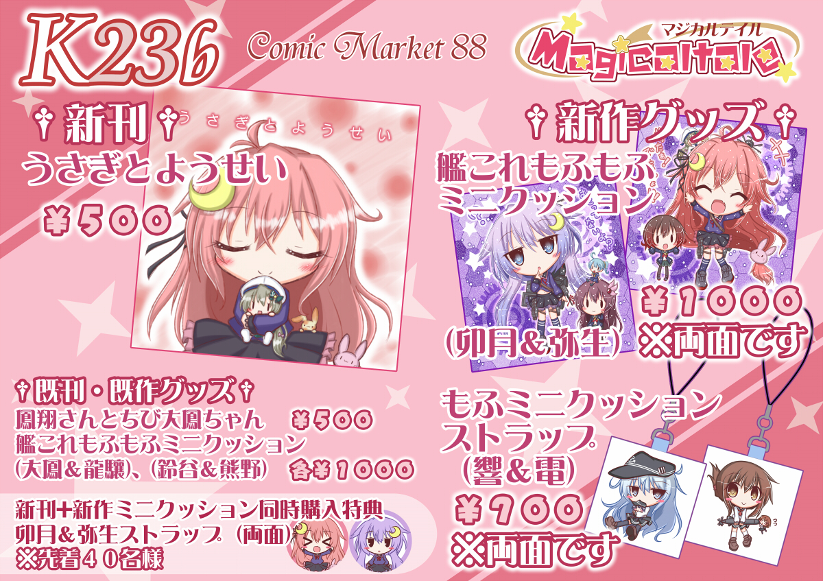 あ、あと今回会場にて新刊と新作ミニクッション(卯月&弥生のやつ)を同時購入された方先着40名様に卯月&弥生ストラップをプレゼントいたします!